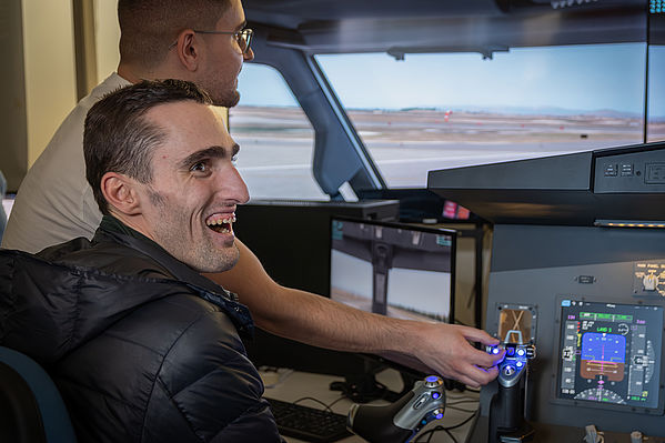 La siguiente parada ha sido el laboratorio de aviónica, donde los propios estudiantes de prácticas del departamento les han explicado cómo funcionan los simuladores con los que se entrenan los pilotos, cómo se cambian las condiciones meteorológicas, cómo se pone en modo día o noche. Pablo ha salido muy orgulloso de la actividad porque ha sido capaz de despegar el avión.