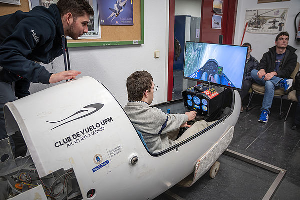 El último punto del recorrido ha sido en el Club de Vuelo de la UPM, donde les esperaba el simulador de vuelo a vela, construido por los propios estudiantes de esta asociación con sede en la ETSIAE. Gonzalo ha sido el primero en subir al planeador para ponerlo a prueba.