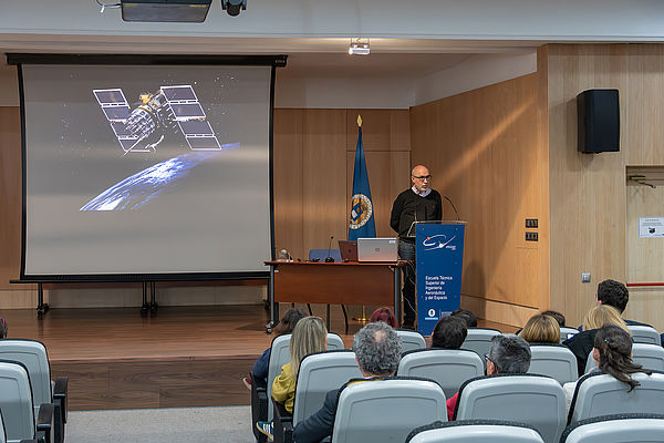 Los recorridos pedagógicos inclusivos por la UPM han comenzado en la Escuela Técnica Superior de Ingeniería Aeronáutica y del Espacio (ETSIAE). El profesor Ángel Rodríguez Sevillano les ha recibido en el Salón de Actos para explicarles qué es lo que aprenden los estudiantes de la ETSIAE. A través de una sencilla dinámica con imágenes, les pide que identifiquen diferentes tipos de aeronaves, sistemas espaciales, zonas de un aeropuerto. Esto ayuda a que los participantes potencien una alfabetización científico-tecnológica básica, familiarizándose con esos conceptos aeroespaciales, otro de los objetivos de aprendizaje de este proyecto de ApS.